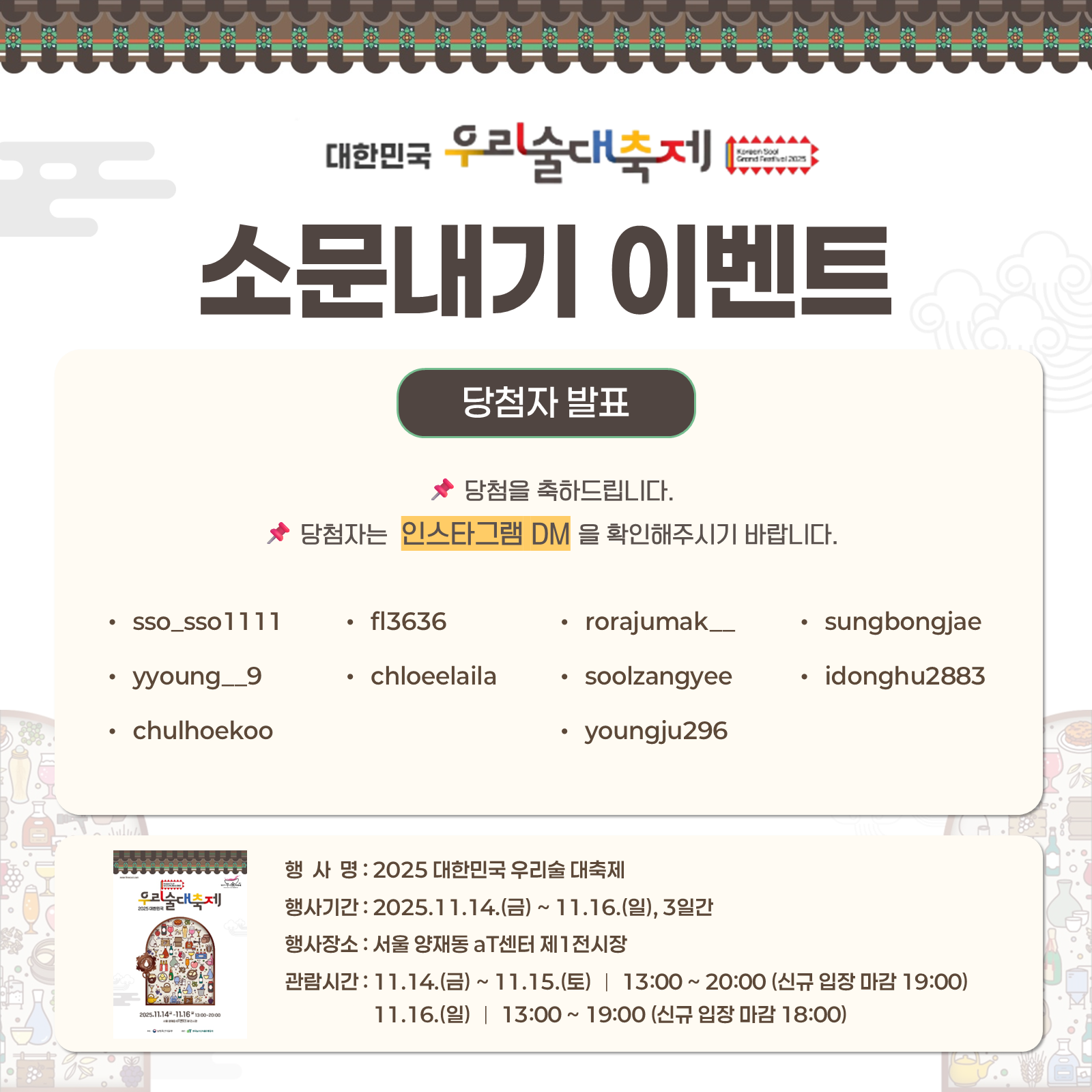 - 2025 대한민국 우리술 대축제 소문내기 이벤트 당첨자 발표