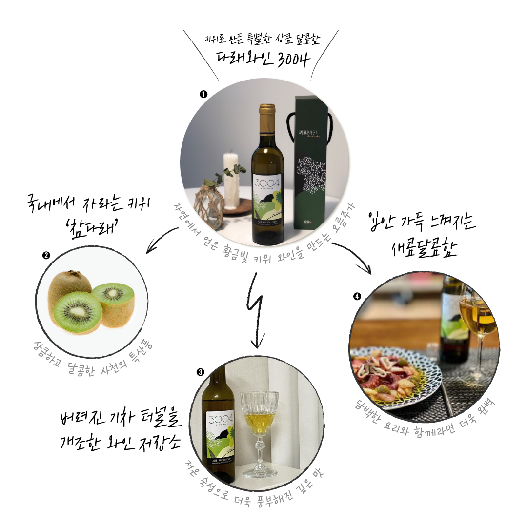 국내에서 자라는 키위의 품종명을 ‘참다래’라고 하는 거 다들 알고 계시죠? ‘참다래’에서 이름을 따 만든 다래와인 3004는 ‘와인’ 하면 흔히 떠올리는 포도가 아니라 키위로 만들어 더욱 특별하게 느껴집니다. 다래와인 3004는 참다래라고 불리기도 하는 키위가 자라기에 적합한 환경을 갖춘 사천에서 탄생했습니다. 풍부한 일조량, 양질의 토지 그리고 해안에 인접한 위치! 이러한 기후적지〮리적 이점이 사천의 키위를 더 상큼하고 달콤하게 자라게 해준답니다!