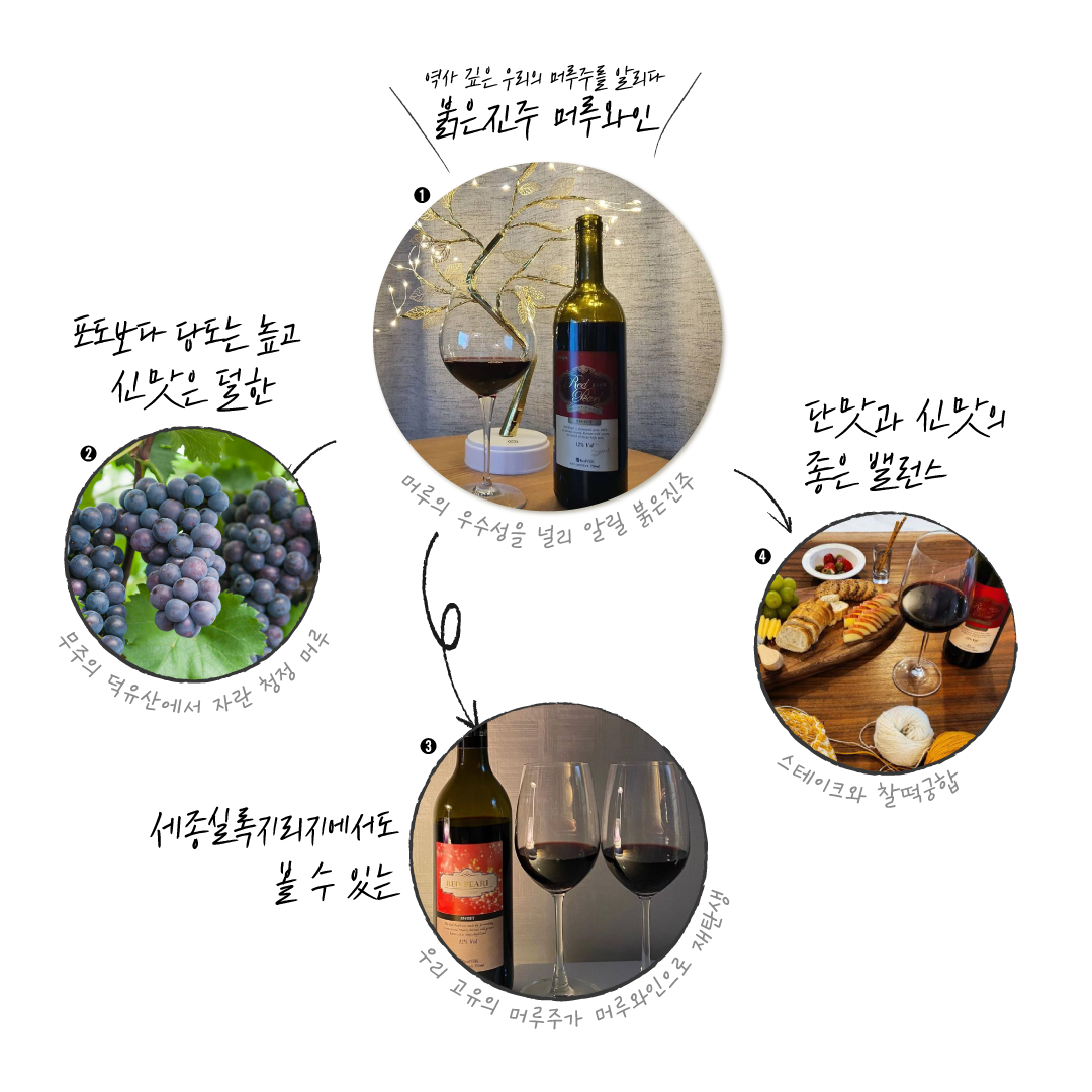 단맛과 신맛의 균형이 좋은 붉은진주 머루와인은 옅은 타닌에 의한 떫은맛 때문에 스테이크와 잘 어울리니 여러분도 한번 드셔보세요!
