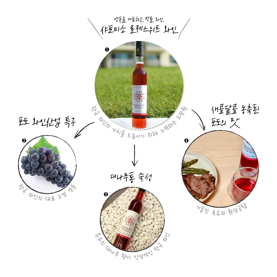 샤토미소 로제스위트 와인은 2018 우리술품평회에서 대상을 수상한 술로 그 품질과 맛이 훌륭하다는 평가를 받고 있었는데요. 포도의 씨와 껍질은 걷어내고 과육만을 착즙해 만들어져 농축된 포도의 맛을 느낄 수 있습니다. 붉은 빛깔, 은은한 향, 새콤달콤한 맛의 조화가 일품입니다. 또한 오크통이 아닌 대나무 통에 숙성하여 더 한국적이고, 특유의 대나무의 향이 인상적입니다!