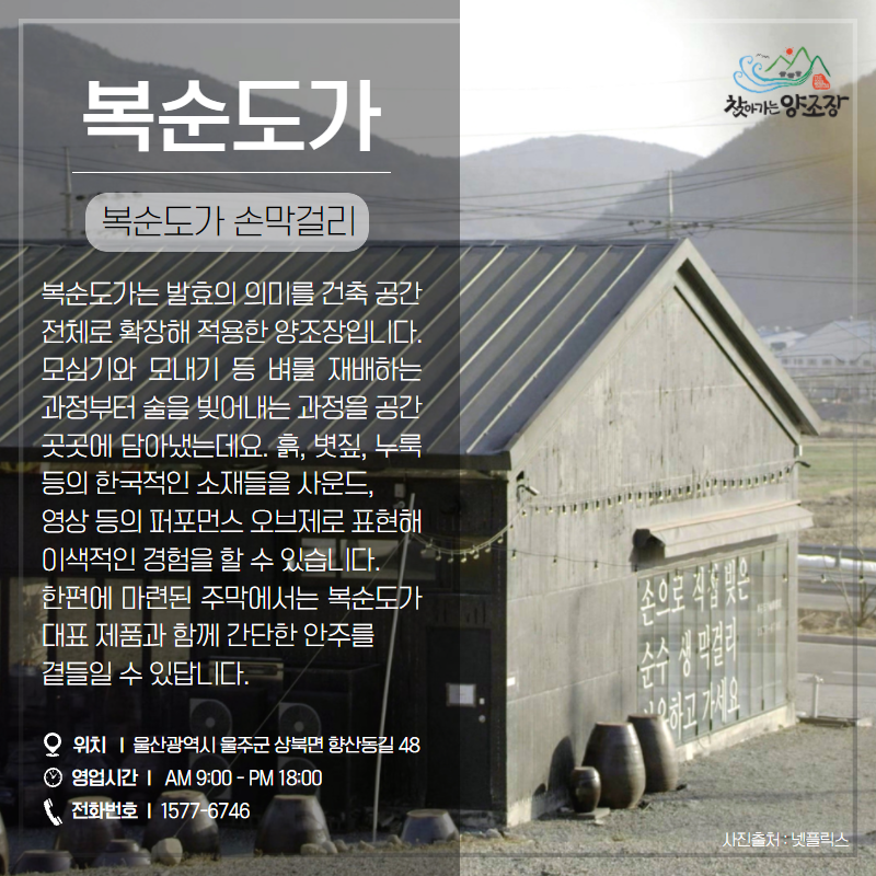 복순도가 손막걸리는 집안 대대로 내려온 가양주를 현대적으로 복원한 복순도가는 발효의 의미를 건축 공간 전체로 확장해 적용한 양조장입니다. 모심기와 모내기 등 벼를 재배하는 과정부터 술을 빚어내는 과정을 공간 곳곳에 담아냈는데요. 흙 ,논, 볏짚, 누룩 등의 한국적인 소재들을 사운드, 영상 등의 퍼포먼스 오브제로 표현해 이색적인 경험을 할 수 있습니다. 한편에 마련된 주막에서는 복순도가 대표 제품과 함께 간단한 안주를 곁들일 수 있답니다.