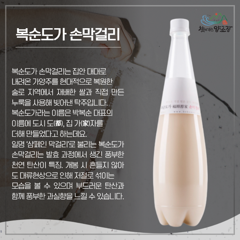 술로 지역에서 재배한 쌀과 직접 만든 누룩을 사용해 빚어낸 탁주입니다. 복순도가라는 이름은 박복순 대표의 이름에 도시 도(都), 집 가(家)자를 더해 만들었다고 하는데요. 일명 ‘샴페인 막걸리’로 불리는 복순도가 손막걸리는 발효 과정에서 생긴 풍부한 천연 탄산이 특징! 개봉 시 흔들지 않아도 대류현상으로 인해 저절로 섞이는 모습을 볼 수 있으며 부드러운 탄산과 함께 풍부한 과실향을 느낄 수 있습니다.
