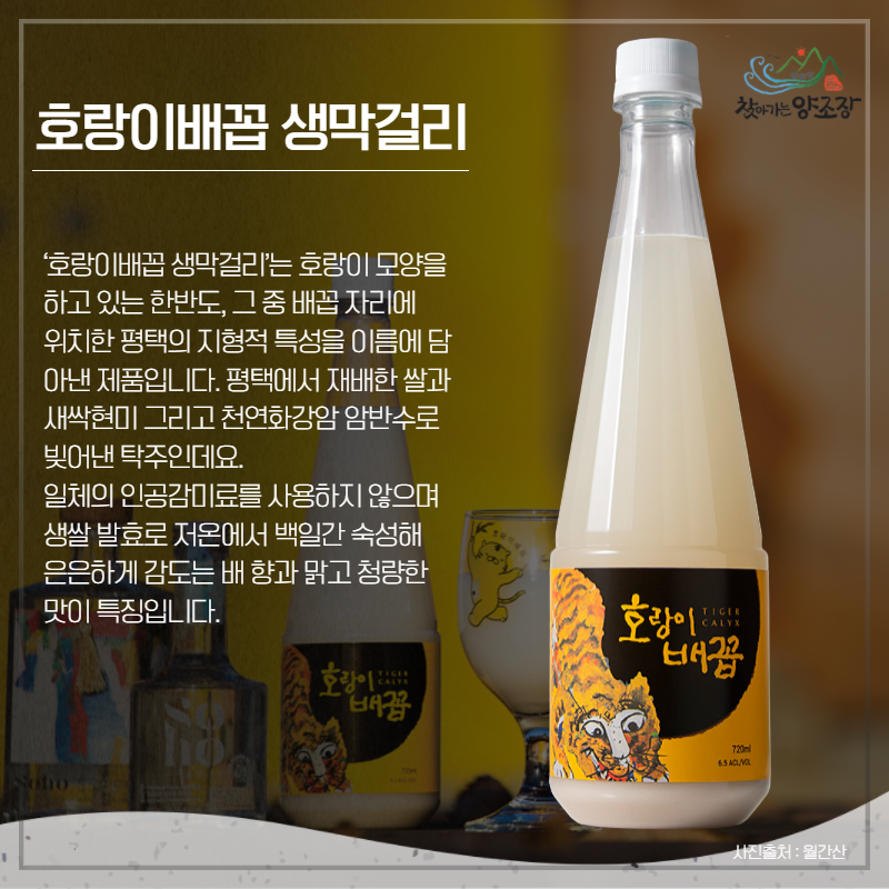 ‘호랑이배꼽 생막걸리’는 호랑이 모양을 하고 있는 한반도, 그 중 배꼽 자리에 위치한 평택의 지형적 특성을 이름에 담아낸 제품입니다. 평택에서 재배한 쌀과 새싹현미 그리고 천연화강암 암반수로 빚어낸 탁주인데요. 일체의 인공감미료를 사용하지 않으며 생쌀 발효로 저온에서 백일간 숙성해 은은하게 감도는 배 향과 맑고 청량한 맛이 특징입니다.