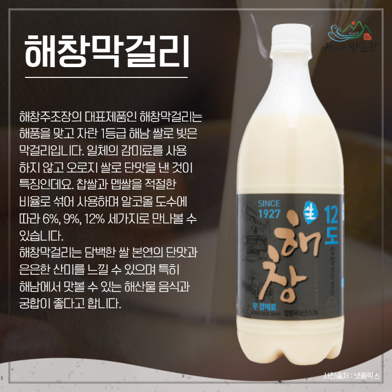 해창주조장의 대표제품인 해창막걸리는 해풍을 맞고 자란 1등급 해남 쌀로 빚어낸 막걸리입니다. 일체의 감미료를 사용하지 않고 오로지 쌀로 단맛을 내는 것이 특징인데요. 찹쌀과 멥쌀을 적절한 비율로 섞어 사용하며 알코올 도수에 따라 6%, 9%, 12% 세가지로 만나볼 수 있습니다. 해창막걸리는 담백한 쌀 본연의 단맛과 은은한 산미를 느낄 수 있으며 특히 해남에서 맛볼 수 있는 해산물 음식과 궁합이 좋다고 합니다.