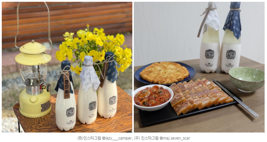담은 막걸리는 청량감은 적지만 부드러운 텍스처가 매력인 탁주입니다. 미세한 산미가 술을 가볍게 만들어주고 마시고 난 뒤 부드러운 곡물가루가 크리미한 느낌을 더해줍니다. 곁들여 먹기 좋은 음식으로는 스테이크와 파스타 등 양식 요리와 아주 잘 어울립니다.