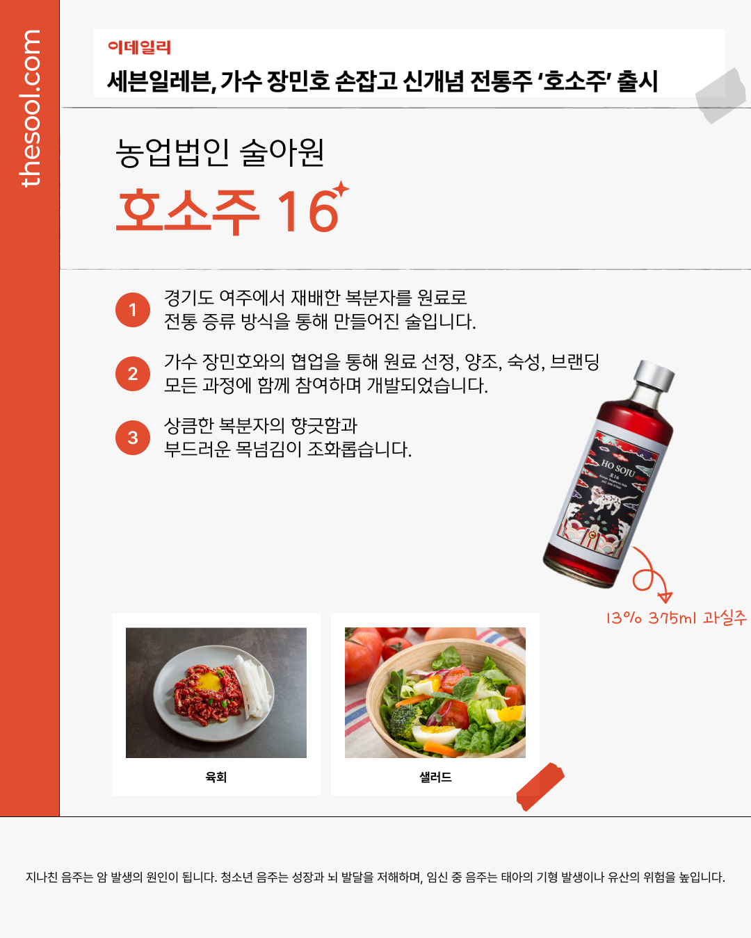 호소주 16은 경기도 여주에서 재배한 복분자를 원료로 전통 증류 방식을 통해 만들어진 술입니다. 가수 장민호와의 협업을 통해 원료 선정, 양조, 숙성, 브랜딩