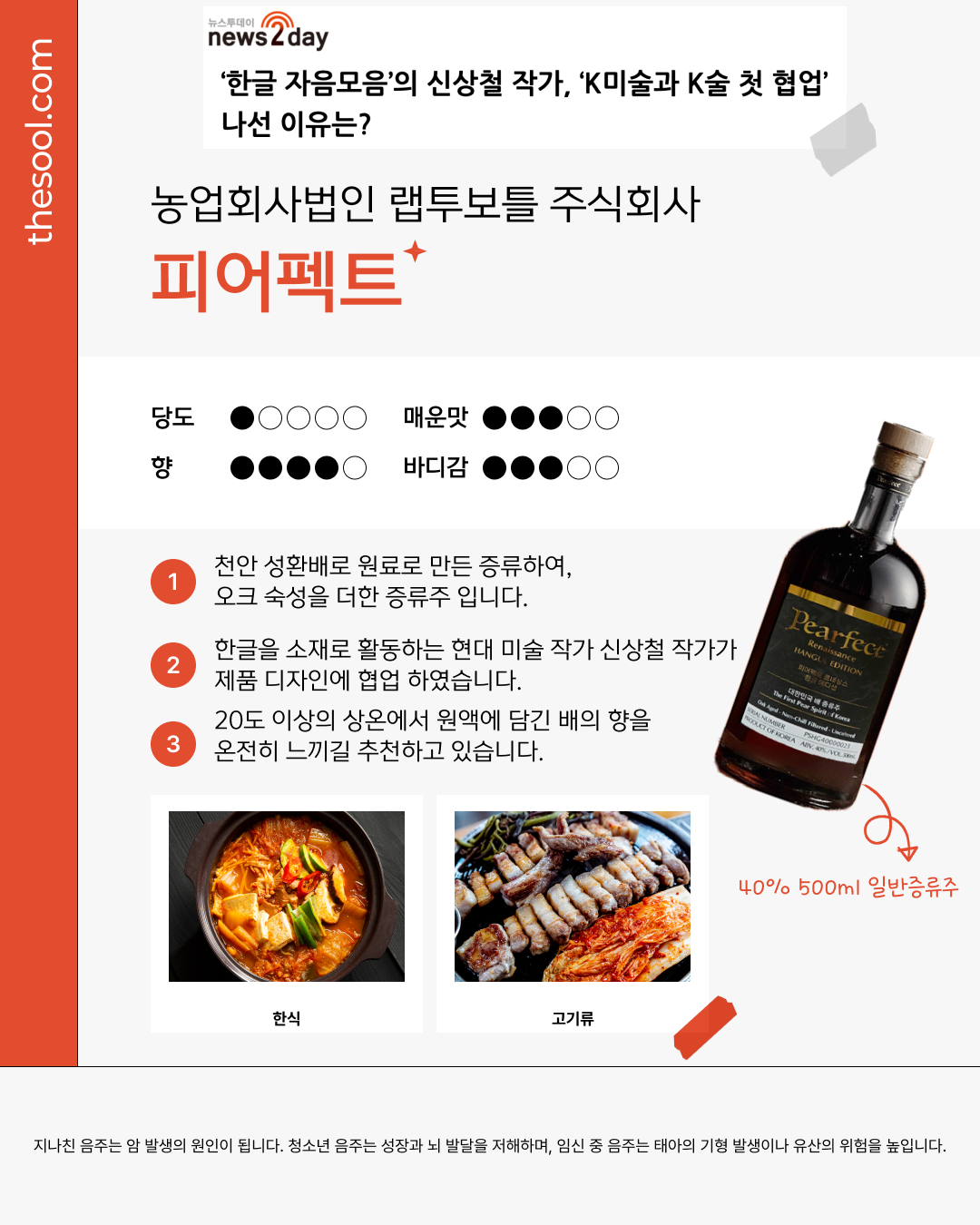 피어펙트 르네상스 한글 천안 성환배로 원료로 만든 증류하여, 오크 숙성을 더한 증류주 입니다. 한글을 소재로 활동하는 현대 미술 작가 신상철 작가가