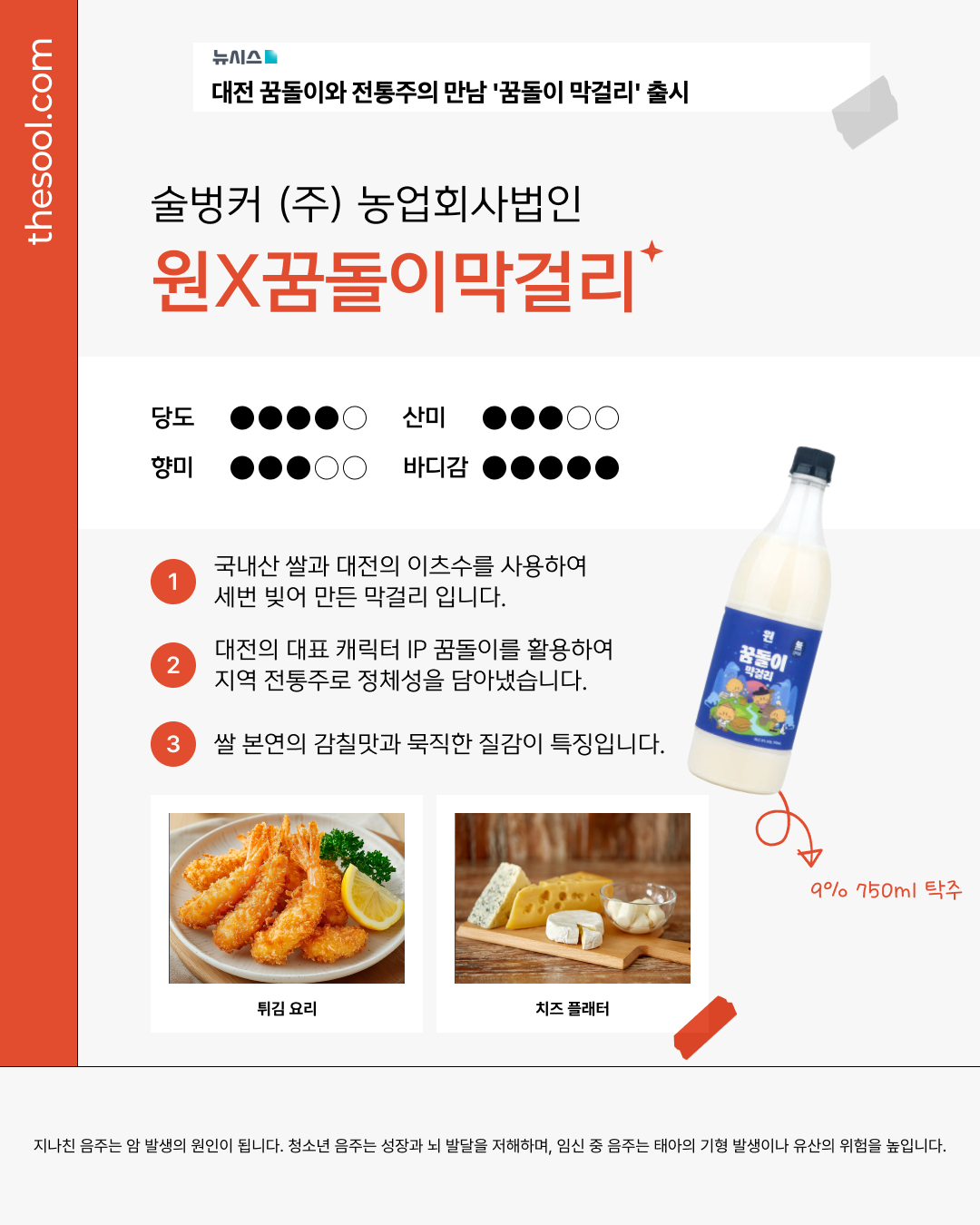 원 X 꿈돌이 막걸리는 국내산 쌀과 대전의 이츠수를 사용하여 세번 빚어 만든 막걸리 입니다. 대전의 대표 캐릭터 IP 꿈돌이를 활용하여
