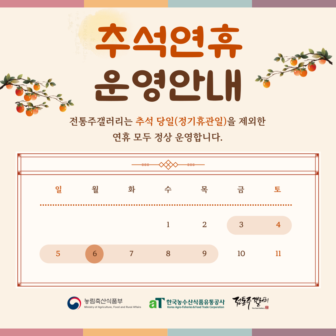 추석연휴 운영 안내 전통주갤러리는 **추석 당일- 10월6일 월요일(정기휴관일)**을 제외한 연휴 기간 동안 정상 운영합니다.